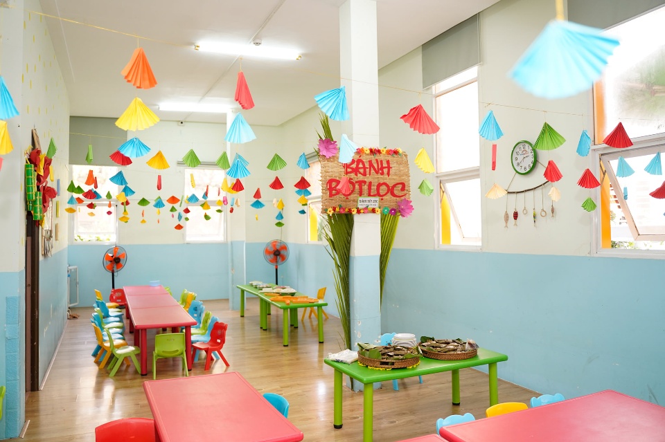 - Phòng học rộng thoáng, các phía đều có cửa sổ đón nhận ánh sáng chan hòa và không khí thoáng mát. Mặt sàn được lót gỗ tạo cảm giác an toàn mỗi lần di chuyển.
