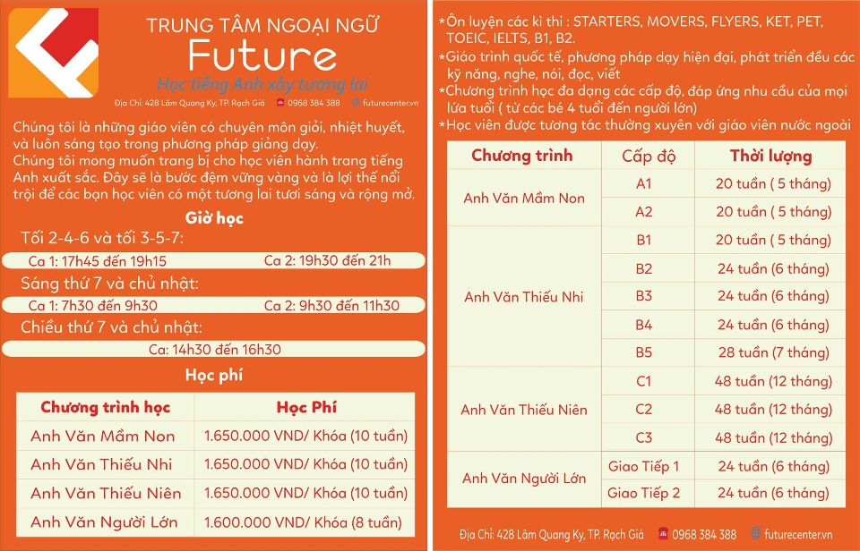 Trung Tâm Ngoại ngữ Future chuyên dạy tiếng Anh Mầm Non, tiếng Anh Thiếu Nhi, tiếng Anh Thiếu Niên và tiếng Anh cho Người Lớn. Đây là một nơi lý tưởng giúp các bạn ở mọi lứa tuổi ôn luyện cho các kì thi quốc tế như: STARTERS, MOVERS, FLYERS, KET, PET, TOEIC, IELTS. Tại đây chú trọng cả bốn kĩ năng nghe nói đọc viết để không những rèn luyện các bạn cho các kì thi quốc tế mà còn ứng dụng trong thực tế cuộc sống và công việc. Ngoại ngữ Future hứa hẹn sẽ là nơi hoàn hảo dành cho bạn.