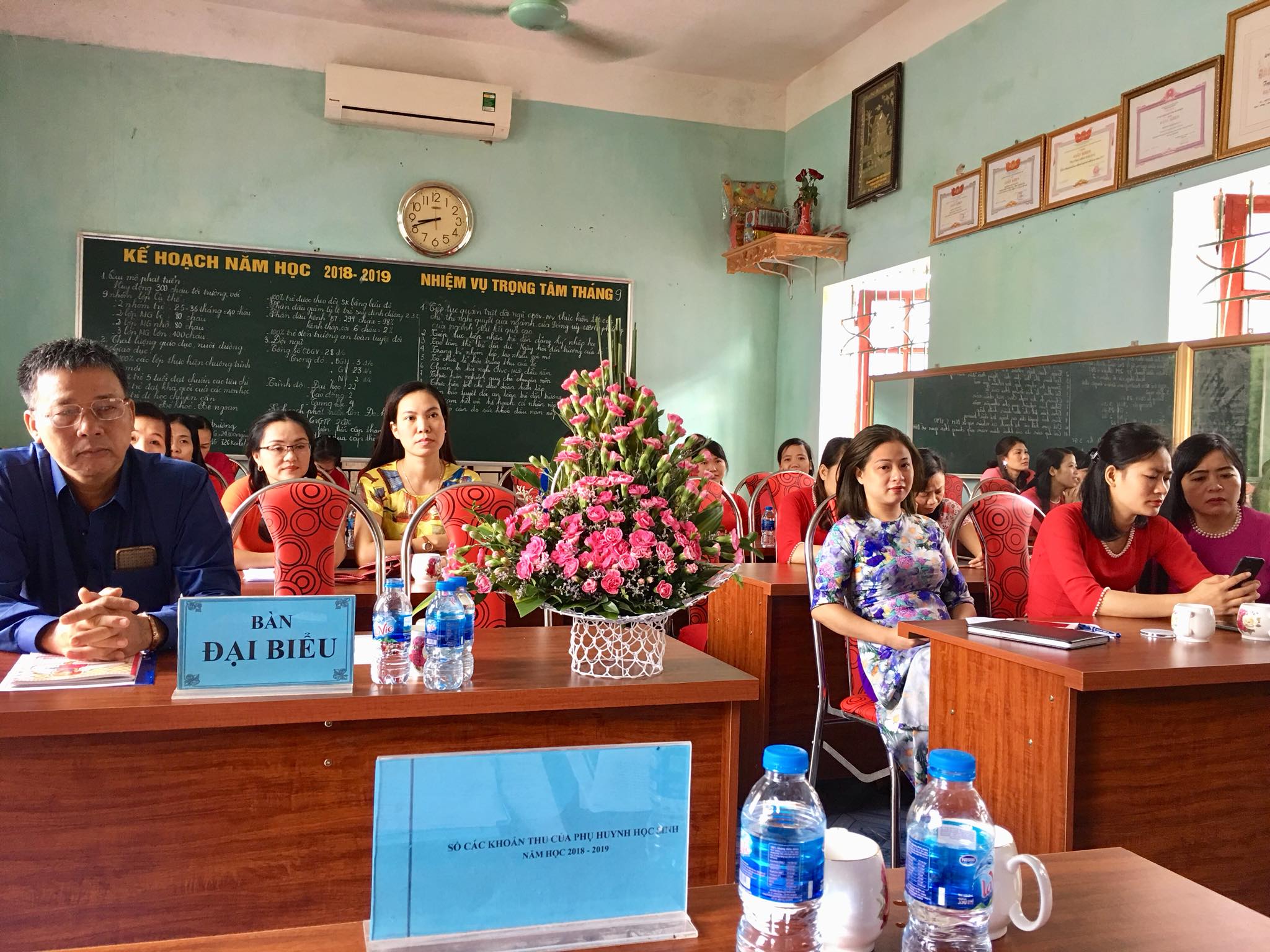 Nhà trường có 22 giáo viên đều đạt chuẩn và trên chuẩn. Phòng học, phòng chức năng, sân chơi đều đạt chuẩn, được trang bị đầy đủ các trang thiết bị hiện đại như tivi, máy chiếu, điều hòa đảm bảo cho công tác chăm sóc giáo dục trẻ.