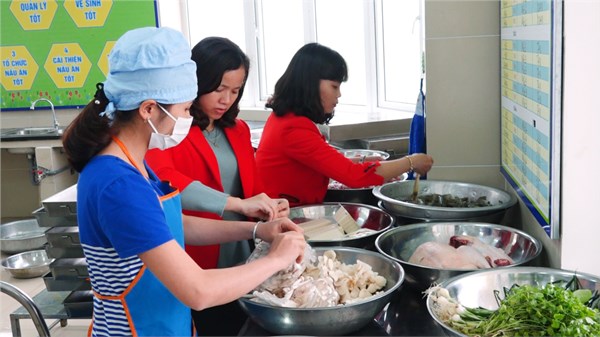Hệ thống bếp một chiều và khâu sơ chế thực phẩm. Một buổi khám sức khỏe cho trẻ do nhân viên y tế thực hiện