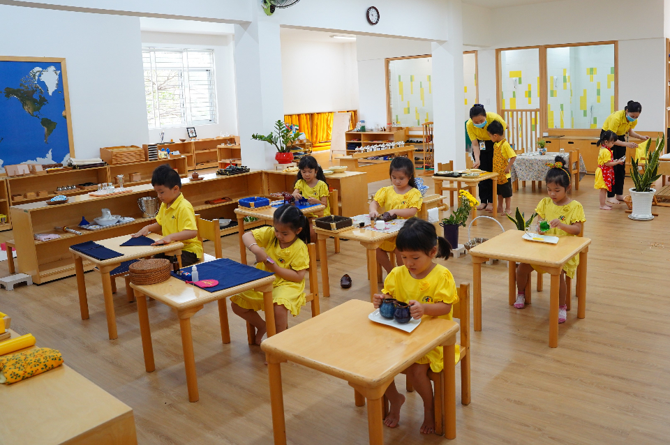 - Phòng học tiện nghi được trang bị đầy đủ giáo cụ Montessori nhập khẩu từ Hà Lan ( cung cấp bởi Nienhuis - nhà sản xuất học cụ Montessori được công nhận bởi hiệp hội Montessori quốc tế (AMI)).