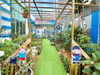 Sân chơi ngoài sân, sân chơi trong nhà đầy đủ đồ chơi cho trẻ.