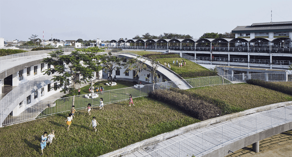 Điểm đặc biệt nhất của trường mầm non ở Biên Hoà là thiết kế hình xuyến kết nối mái nhà với sân chơi tạo nên một màu xanh trải dài cực đẹp mắt. Mái vòm này được giảm dần độ cao cho tới khi chạm tới mặt đất. Tất cả các phòng học và phòng chức năng đều nằm ở dưới. Mọi nơi tại đây đều được bảo vệ bởi một hàng rào chắc chắn để đảm bảo an toàn cho các em nhỏ.