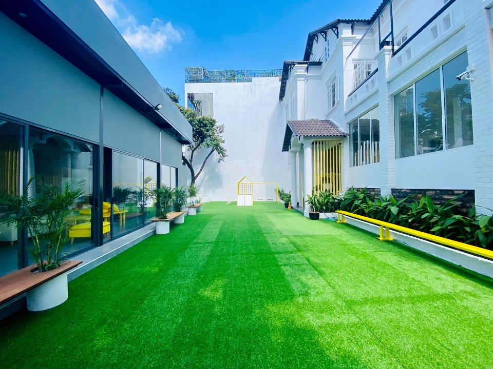 Sân chơi ngoài trời rộng rãi, thoáng mát được trải cỏ nhân tạo đảm bảo an toàn cho trẻ.