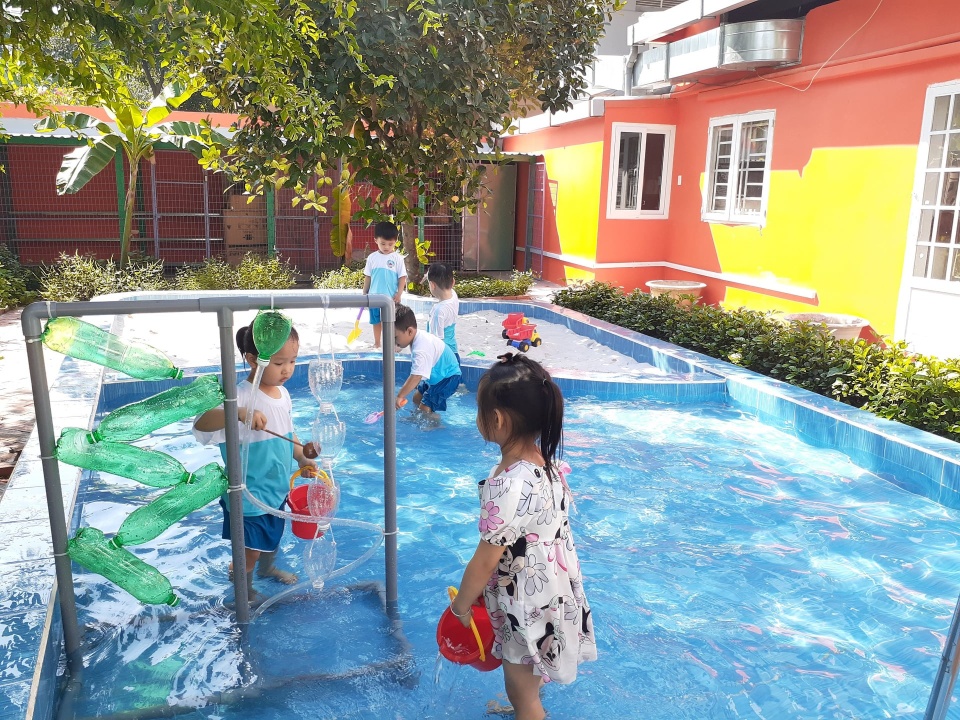 Khu chơi cát, chơi nước, vườn rau - nuôi thú.