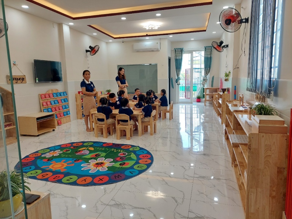 Có 7 phòng học, 3 phòng chức năng, 2 sân chơi, 1 sân tắm nắng, hồ bơi.