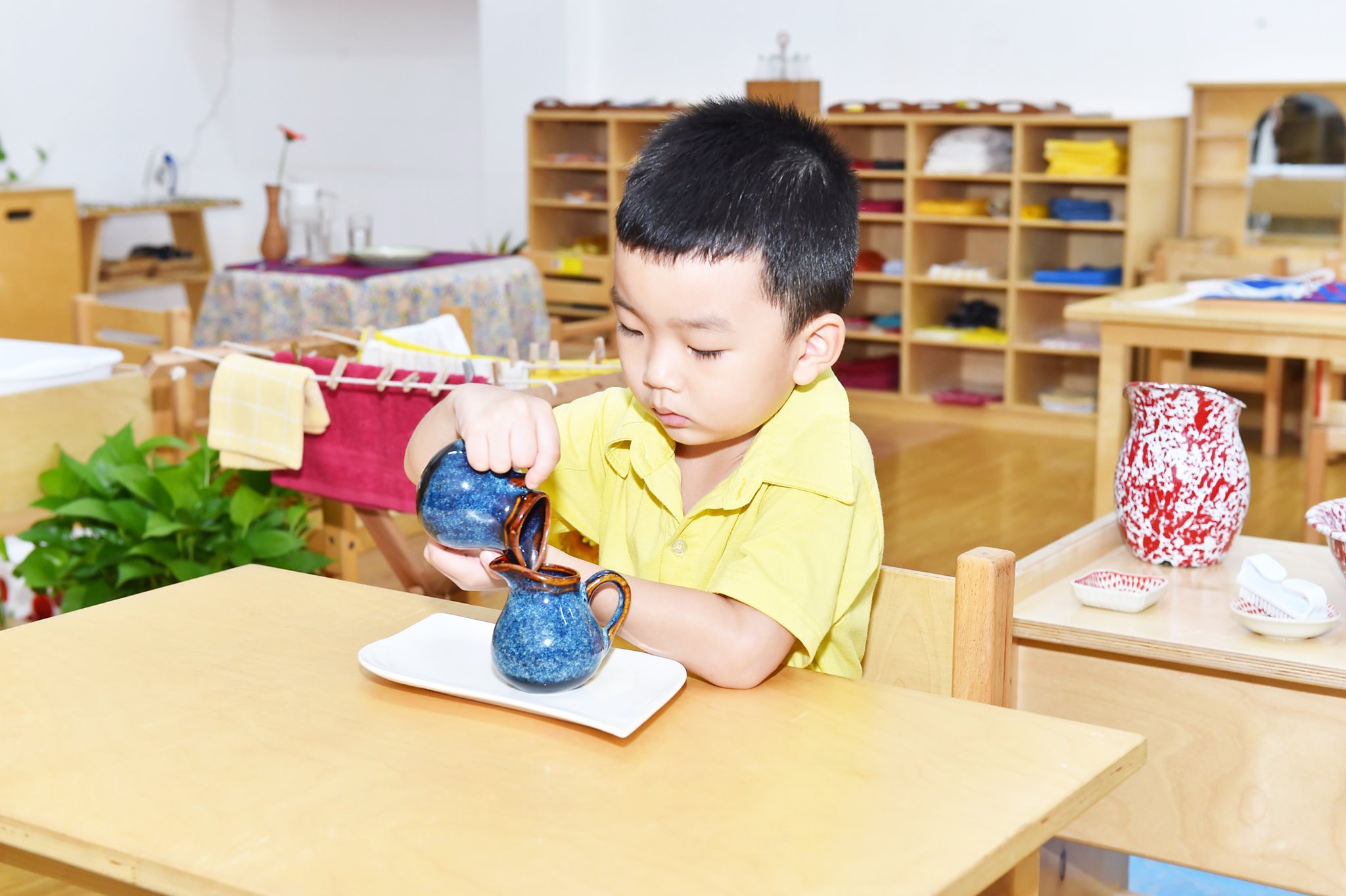 - Mỗi phòng học các giáo cụ được bố trí theo phương pháp Montessori chính thống, phù hợp để phát triển tư duy cho trẻ, gồm 5 góc học tập chính: Góc thực hành cuộc sống, Góc Toán học, Góc Văn hóa, Góc giác quan, Góc ngôn ngữ.