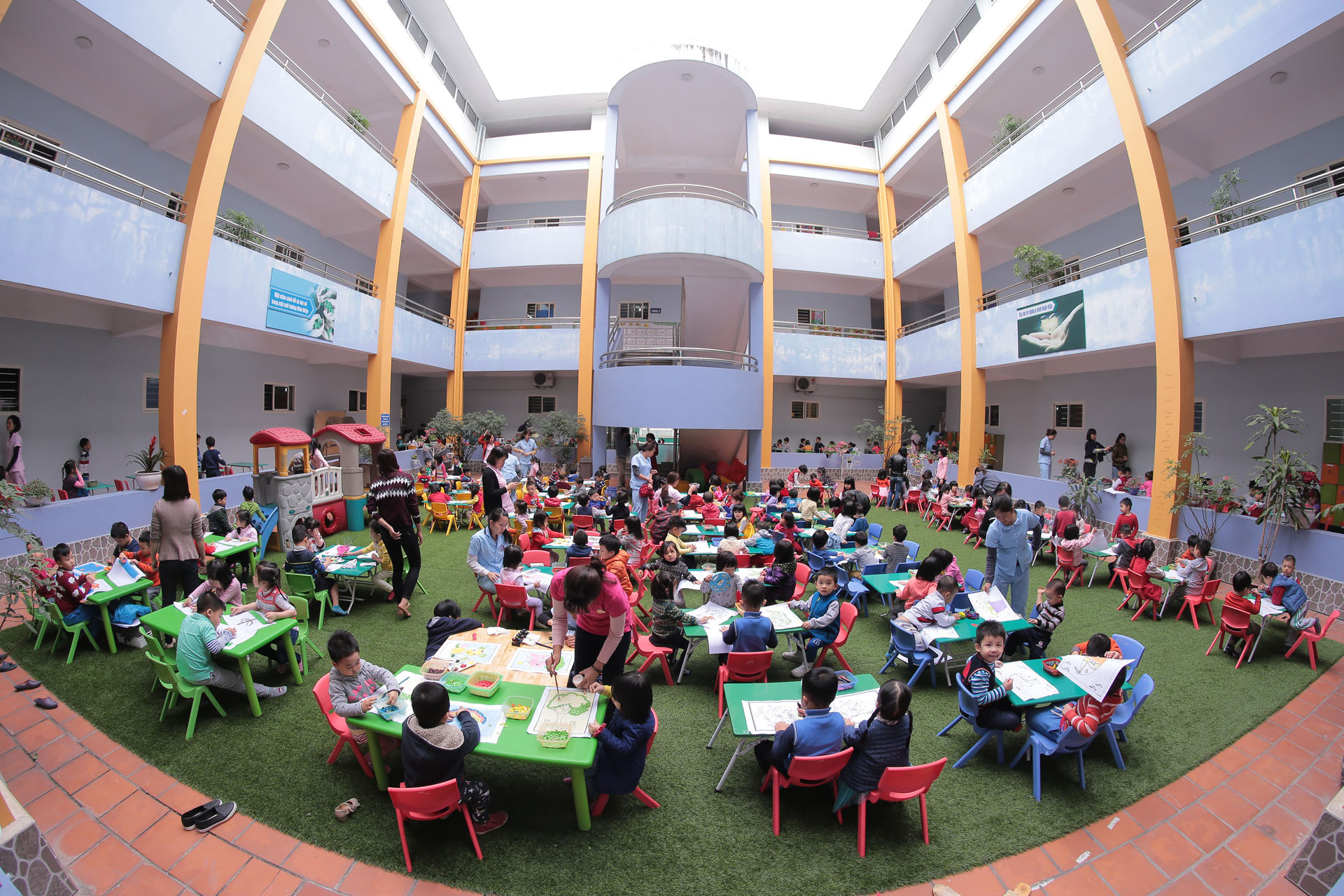 Sân trường rộng rãi cùng khu vận động liên hoàn , nhà bóng, leo núi hiện đại.