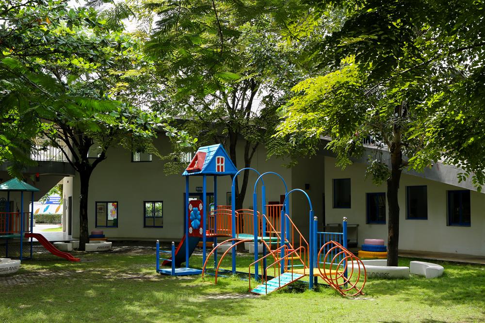 Các lớp học gắn nhiều cửa kính, bên ngoài được phủ bởi những giàn cây leo tạo cảnh quan thoáng mát và đầy nắng, gió tự nhiên dễ dàng lùa từ bên ngoài vào phòng học. Các khu vui chơi lộ thiên trang bị nhiều mô hình trò chơi vận động được sắp đặt khéo léo trong khuôn viên trường, tạo điều kiện cho trẻ phát huy tối đa khả năng vận động, phát triển tư duy và thể chất.