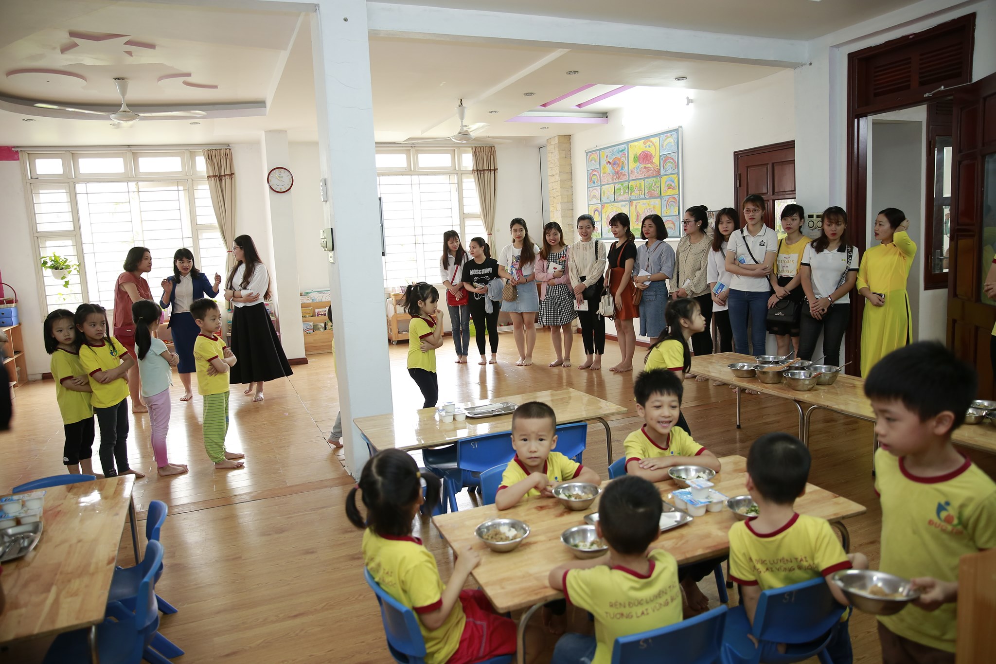 "Phòng học rộng, ánh sáng chan hòa, cầu thang di chuyển thuận lợi, nhà ăn sạch sẽ. Đồ dùng học tập phong phú, đầy đủ"